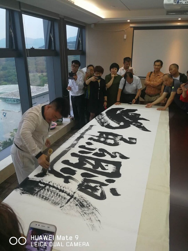 图为著名书画家翁子易现场欣然作画“一笔龙”